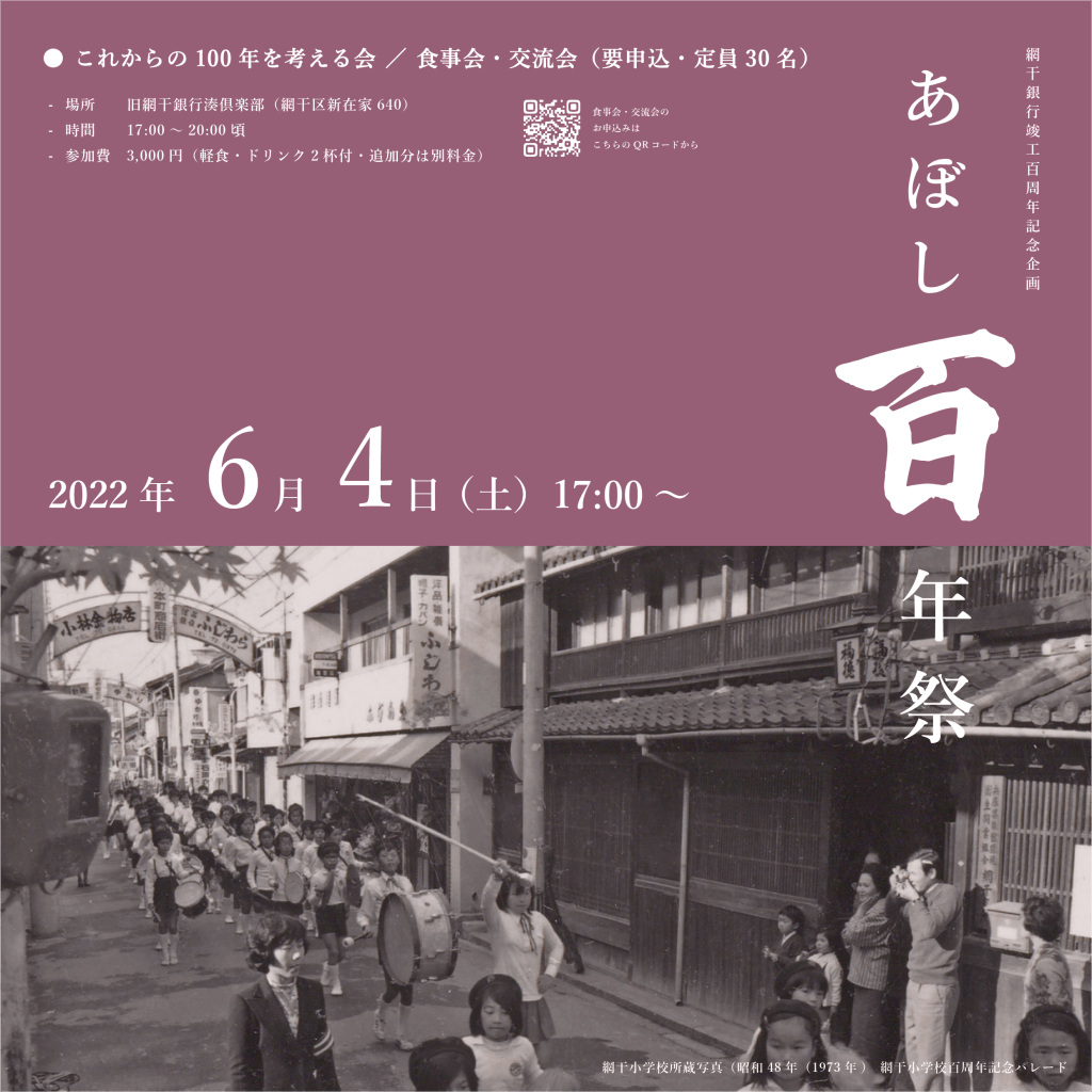 網干のランドマーク的存在でもある旧網干銀行本店は、1922年5月に落成式を執り行い、今年5月14日に竣工100周年を迎えました。この100周年をきっかけに、網干の100年を振り返り、これからの100年を考える機会を設けたい想いで、地域のみなさまのご協力のもと「あぼし百年祭」を開催いたします。(河北)